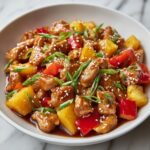 This Air Fryer Pineapple Chicken recipe combines tender chicken breasts, fresh pineapple, and vibrant bell peppers coated in a flavorful blend of teriyaki and barbecue sauces. Quickly cooked at high heat in the air fryer, this dish delivers a perfect balance of sweet, savory, and tangy flavors with minimal effort, ready in just 21 minutes. Serve it over rice for a delicious, healthy weeknight meal.