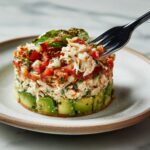On a serving plate, start by spreading half of the avocado mixture as the bottom layer. Then add the tuna mixture on top of the avocado, forming a second layer. Finally, spoon half of the fresh pico de gallo salsa over the tuna. Repeat this layering for the second serving. The layers create a visually appealing dish that’s as beautiful as it is delicious.