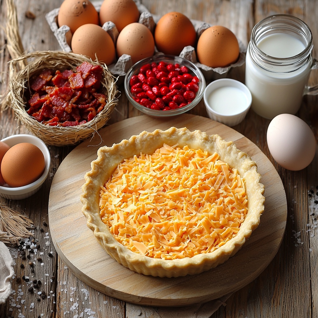 - Assemble Base Layer: Sprinkle the shredded sharp cheddar cheese evenly into the bottom of the unbaked pie crust. Then, distribute the well-drained diced pimentos over the cheese, followed by an even layer of crumbled cooked bacon. This layering creates a flavorful foundation for the custard filling.