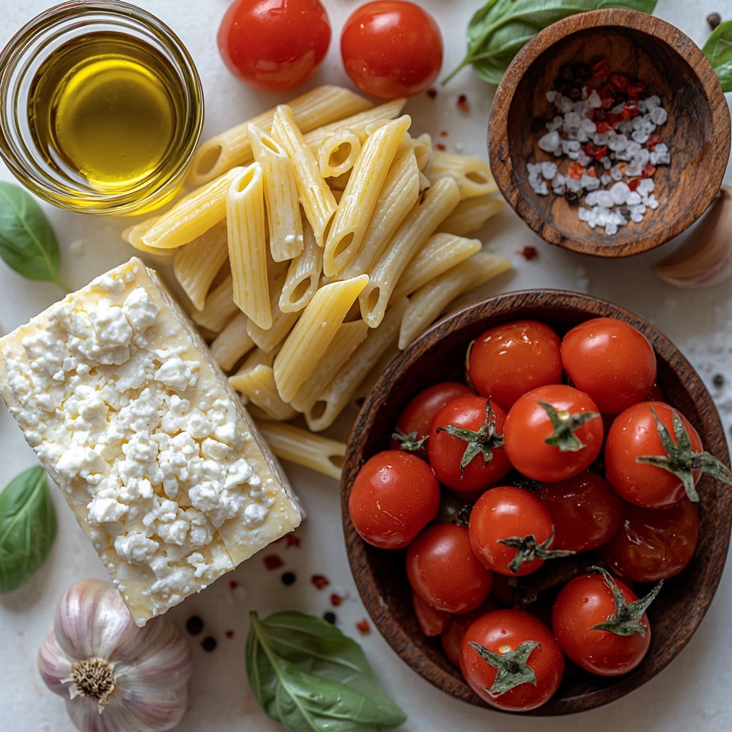 The beauty of this recipe lies in its simplicity—each ingredient is very basic but essential, playing a crucial role in building the dish’s wonderful flavor, texture, and vibrant color. From the smooth feta to the burst of cherry tomatoes, every component works harmoniously to make this baked feta pasta unforgettable.