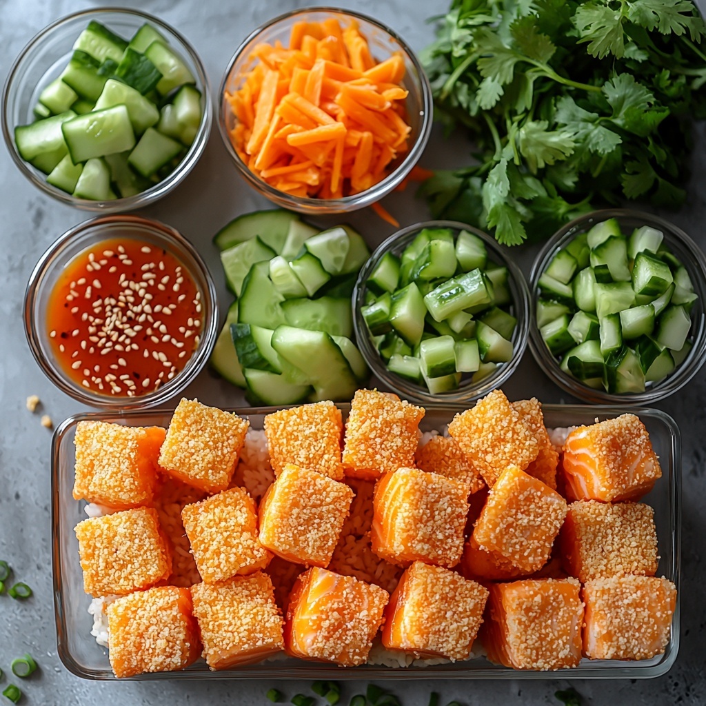 - Avocado (1, sliced): Creamy slices that contrast wonderfully with the crisp salmon bites.