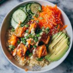These Bang Bang Salmon Bites Bowls feature crispy baked salmon cubes coated in a flavorful panko breadcrumb crust, topped with a creamy and spicy bang bang sauce. Served on a bed of nutritious brown rice and accompanied by fresh avocado, shredded carrots, and cucumber, this dish offers a delightful blend of textures and bold flavors perfect for a quick and satisfying meal.