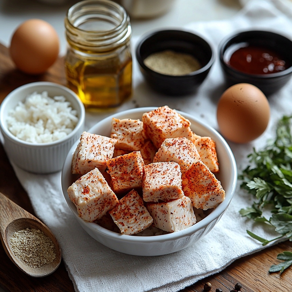 The beauty of this BBQ Chicken Fried Rice Recipe lies in its simple, accessible ingredients that each play a vital role in building that fantastic smoky-sweet umami profile. From juicy chicken breast to aromatic spices and a punchy Japanese BBQ sauce, every item is essential for layering rich flavors and perfect texture.