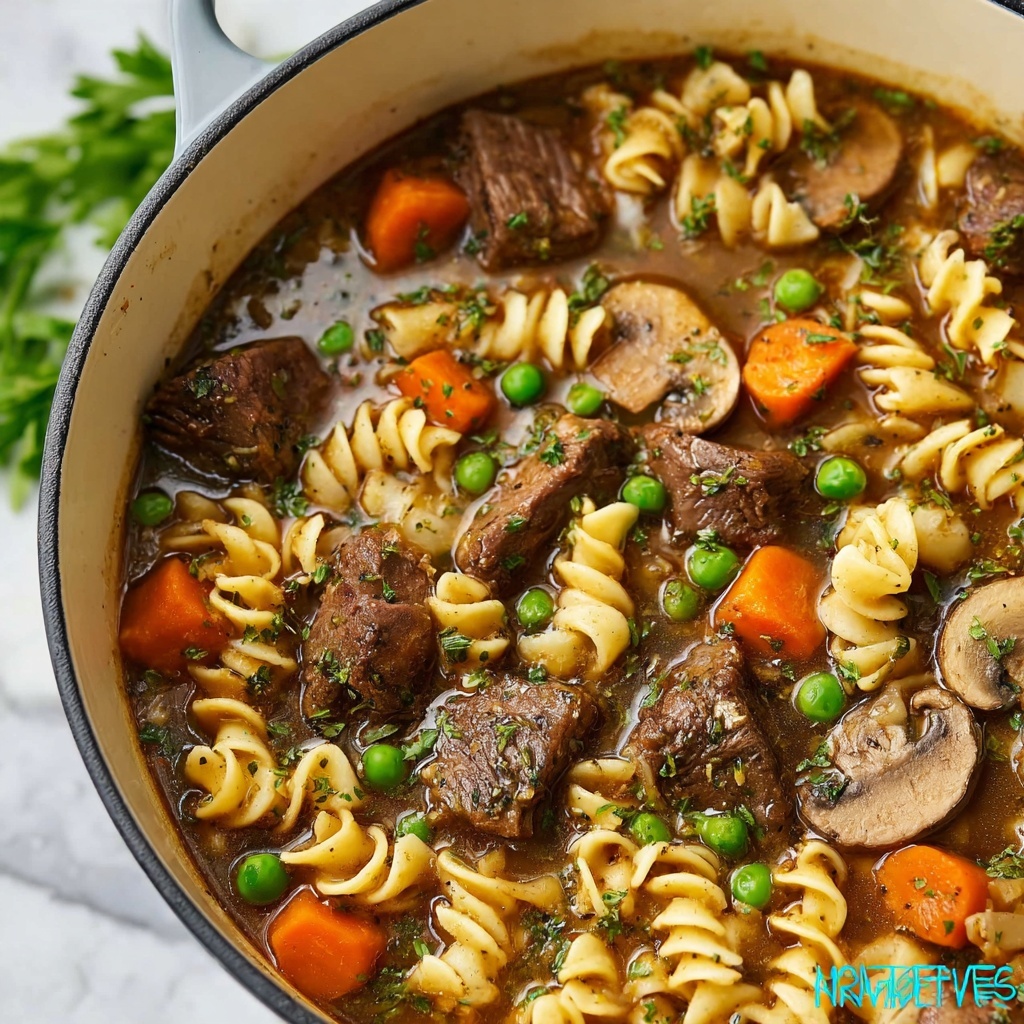 Definitely! Sear the meat and sauté the vegetables as instructed, then transfer everything into a slow cooker with broths and seasonings. Cook on low for 6-8 hours or high for 3-4 hours until the beef is tender before adding peas and cooked noodles.