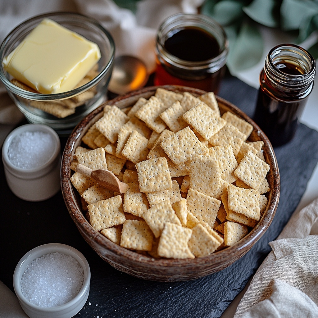 Getting ready to make this Caramel Crunch Oyster Crackers Recipe is a breeze because it calls for simple pantry staples that each bring something special to the table. From the buttery richness to the caramel’s deep sweetness, every ingredient plays a key role in creating the snack’s unforgettable flavor and perfect crunch.