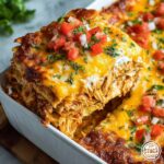 This Chicken Enchilada Casserole is a comforting layered Mexican-inspired dish featuring tender shredded chicken cooked with taco seasoning and onions, stacked between flour tortillas, enchilada sauce, and melted cheddar cheese. Baked until bubbly and golden, it’s perfect for a family dinner or gathering, delivering bold flavors and hearty satisfaction in every bite.