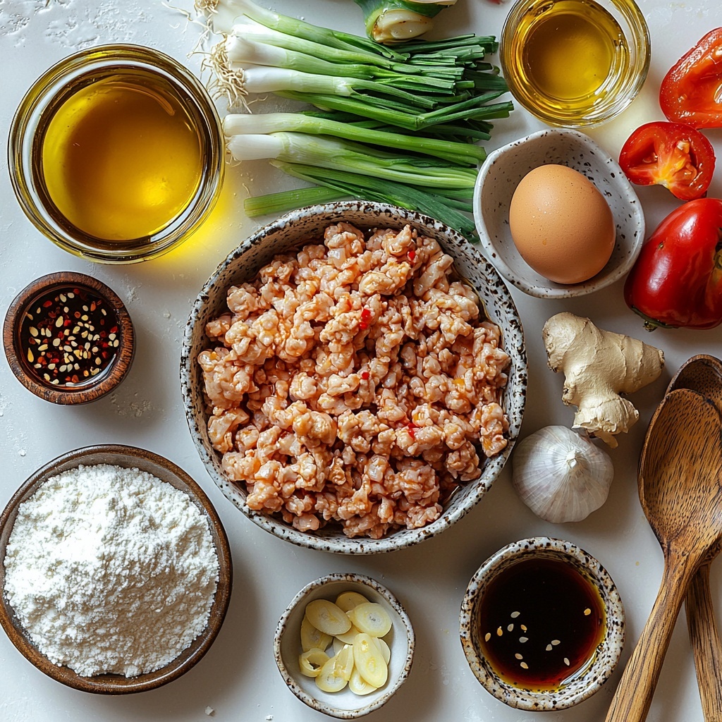 In a spacious mixing bowl, combine the ground chicken with minced garlic, ginger paste, soy sauce, egg, sesame oil, all-purpose flour, cracked black pepper, red pepper flakes, and one tablespoon of diced green onions. Mix everything thoroughly until all ingredients meld together into a cohesive mixture. The egg and flour help hold the shape while the spices infuse flavor deep inside. Next, use a medium cookie scoop or your hands to form small golf ball-sized portions and place them on a baking sheet, ready for frying.