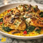 - Assemble Dish: Spread the seasoned chicken evenly in a large baking dish. Layer the sautéed spinach and mushrooms on top of the chicken.