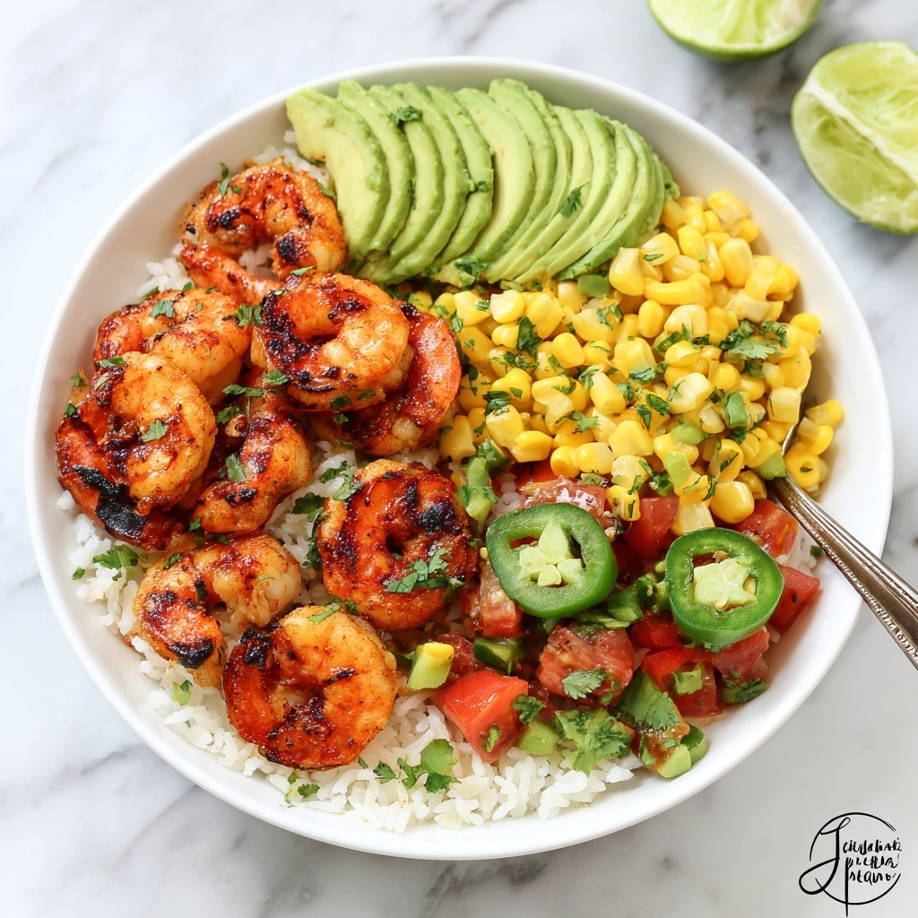 Start by dividing steamed white or brown rice evenly into serving bowls. Top each bowl with a generous portion of the chipotle garlic shrimp, then pile on a scoop of the mango avocado salad. Finish with some sweet roasted corn kernels scattered on top for that extra pop of texture and flavor. Serve immediately for the best experience — the combination of warm rice, spicy shrimp, and cool fruity salad is truly irresistible.