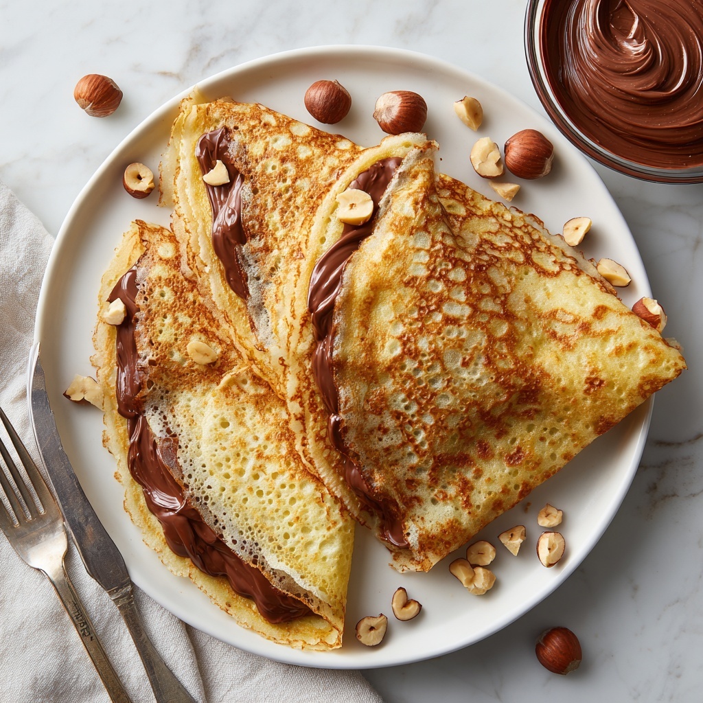 Indulge in these delicate French chocolate hazelnut stuffed crepes, perfectly thin and filled with rich, creamy chocolate hazelnut spread. Finished with a light dusting of powdered sugar, these crepes make a quick and elegant dessert or sweet breakfast treat that can be served warm to enhance their melt-in-your-mouth goodness.