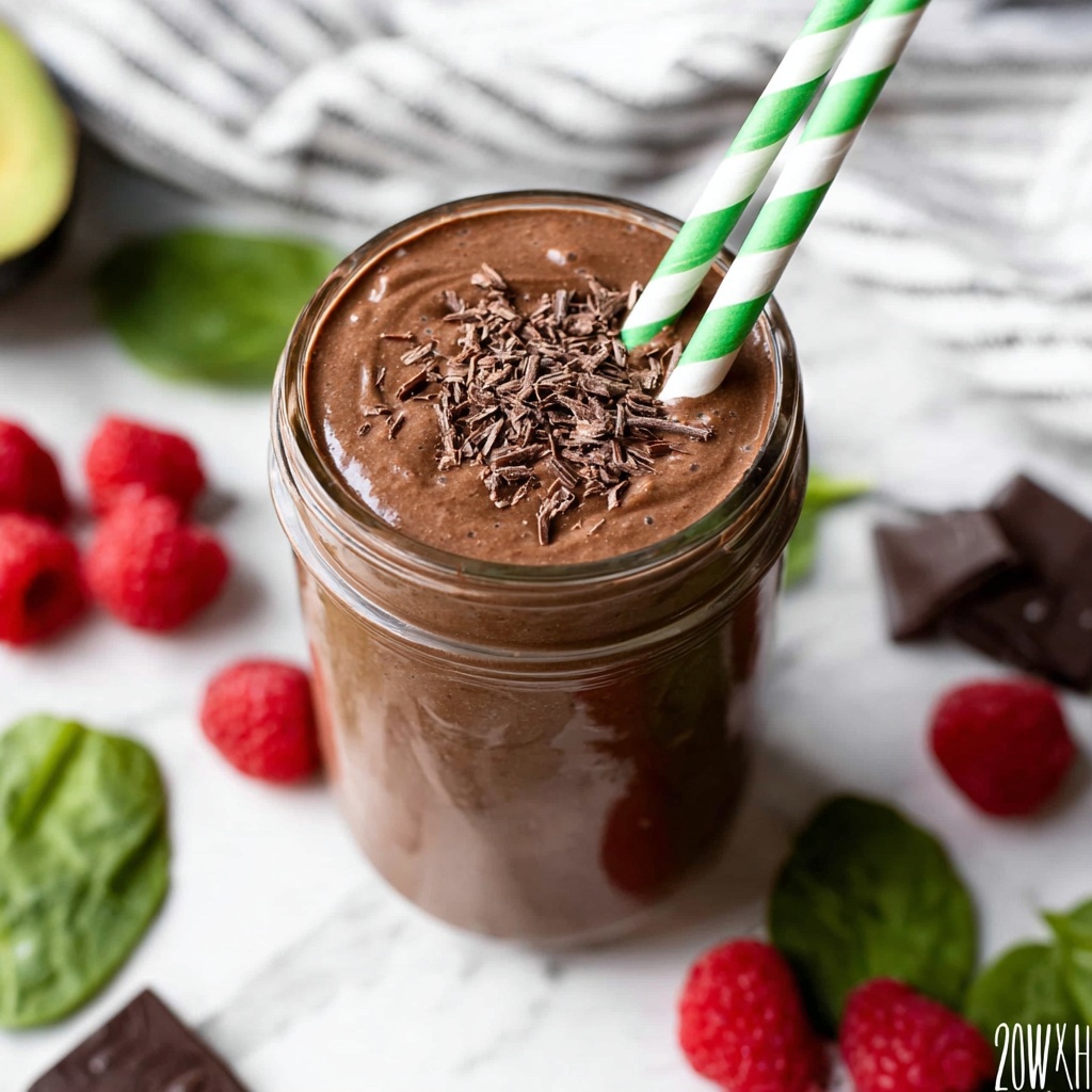 Try serving your Chocolate Raspberry Smoothie with Avocado Recipe in clear glass jars to showcase its beautiful color contrast. Layering it with a dollop of Greek yogurt or granola on top transforms it into a mini parfait that’s both eye-catching and extra indulgent.