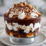 A decadent and indulgent Chocolate Toffee Trifle featuring layers of moist chocolate cake, creamy whipped cream, rich caramel and fudge sauces, sweetened condensed milk, and crunchy chopped Heath or Skor bars. Perfect for parties and gatherings, this no-bake dessert is assembled quickly and best served chilled.