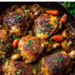 Classic Coq Au Vin is a traditional French dish featuring tender chicken pieces slow-cooked in a rich red wine sauce with crispy bacon, mushrooms, pearl onions, and aromatic herbs. This hearty, flavorful stew is perfect for an impressive dinner and pairs wonderfully with crusty bread or mashed potatoes.