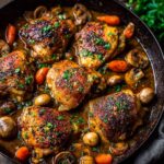 Classic Coq Au Vin is a traditional French dish featuring tender chicken pieces slow-cooked in a rich red wine sauce with crispy bacon, mushrooms, pearl onions, and aromatic herbs. This hearty, flavorful stew is perfect for an impressive dinner and pairs wonderfully with crusty bread or mashed potatoes.