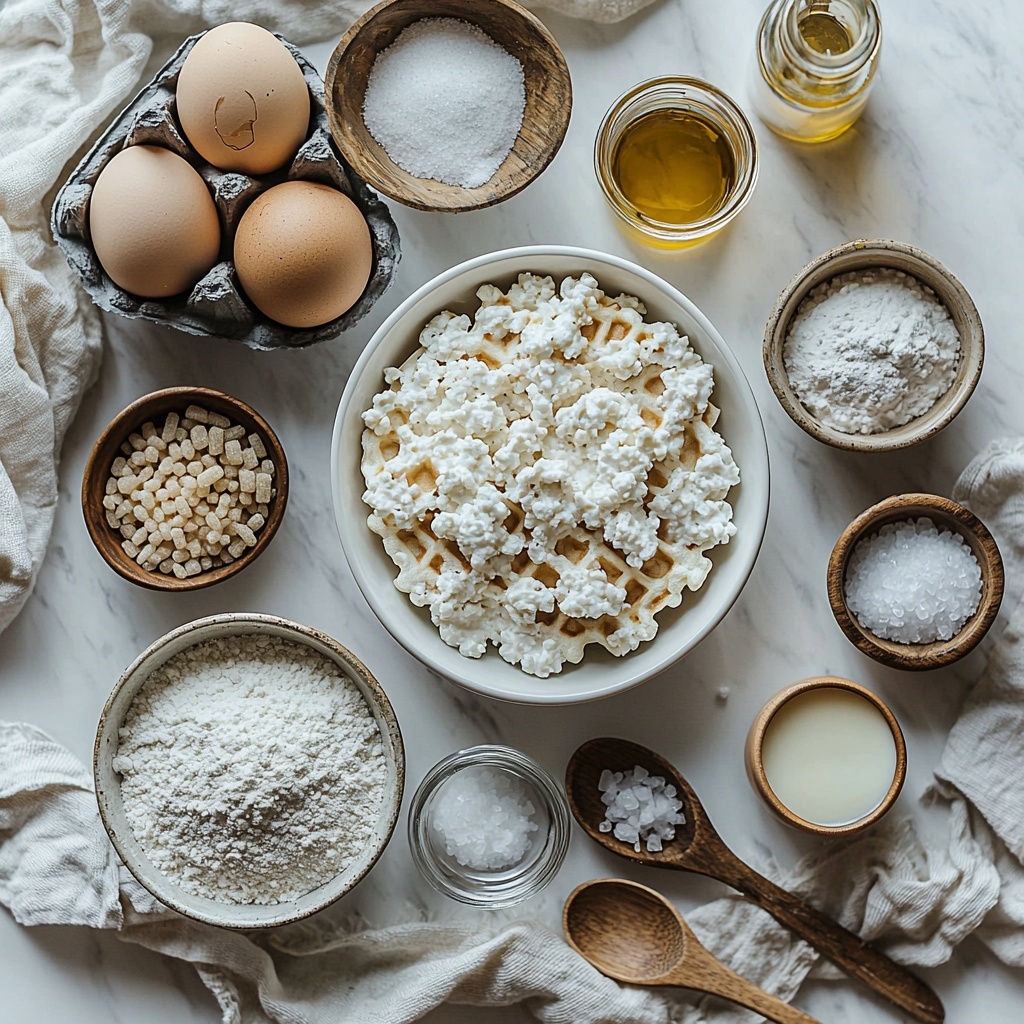 This Cottage Cheese Waffles Recipe calls for simple, everyday ingredients that each play an essential part in achieving the perfect texture, flavor, and color. Every element works in harmony: flour builds the structure, eggs bring the lift and richness, and cottage cheese adds moisture with a protein boost.