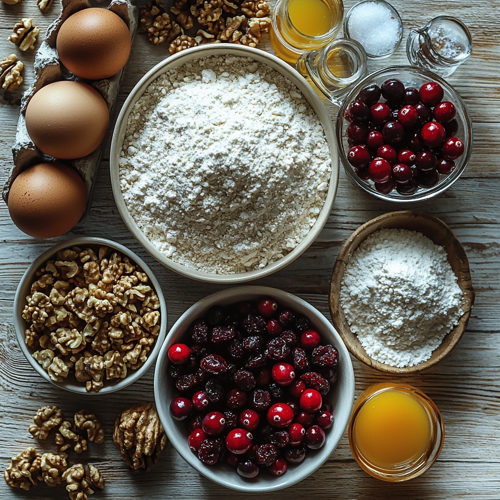These ingredients are straightforward yet thoughtfully chosen to create a harmonious loaf bursting with texture and flavor. Each item adds something special—flour forms the base, walnuts bring crunch, and cranberries add a vibrant pop of tartness. Together, they create a loaf that’s both comforting and exciting.