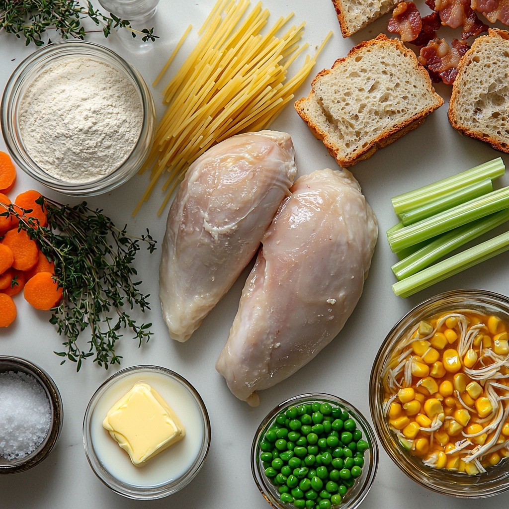 A comforting and creamy chicken noodle soup featuring tender chicken breast, fresh vegetables, sweet corn, and broken angel hair pasta, topped with homemade mini croutons and crispy bacon bits. Perfect for a hearty lunch or dinner, this soup combines rich flavors and satisfying textures in about 40 minutes.