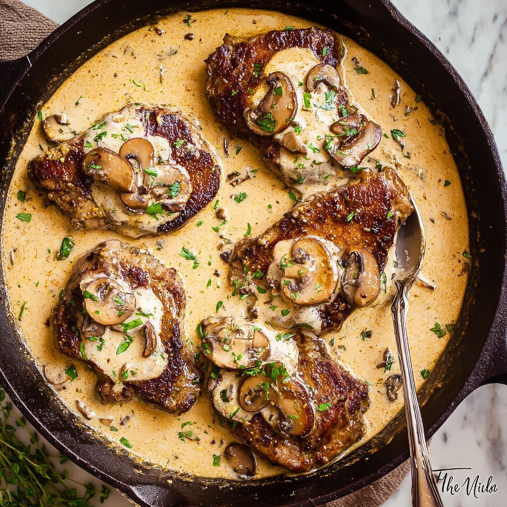 For a stunning presentation, arrange the pork chops on a platter with the creamy mushroom sauce ladled over. Garnish with fresh parsley and place roasted garlic cloves or sautéed mushrooms around the edges. You can also serve each pork chop individually on warmed plates with a neat drizzle of sauce and a side of colorful vegetables for a restaurant-quality feel at home.