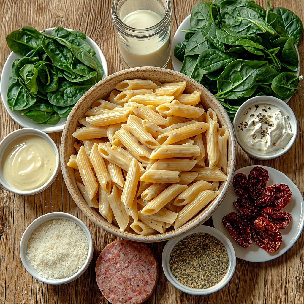 These ingredients might seem straightforward, but each one plays an essential role in building layers of flavor, texture, and color that make this Creamy Tuscan Sausage Pasta Recipe truly unforgettable.