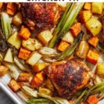 This Crispy Roasted Chicken Thighs With Veggies recipe features bone-in, skin-on chicken thighs marinated in a flavorful mix of garlic, soy sauce, honey, and ginger, roasted alongside hearty Yukon gold potatoes, sweet potatoes, carrots, celery, and shallots. The result is a perfectly crisp and juicy chicken with tender, caramelized vegetables, making for a satisfying and wholesome one-pan meal.