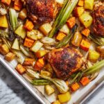 This Crispy Roasted Chicken Thighs With Veggies recipe features bone-in, skin-on chicken thighs marinated in a flavorful mix of garlic, soy sauce, honey, and ginger, roasted alongside hearty Yukon gold potatoes, sweet potatoes, carrots, celery, and shallots. The result is a perfectly crisp and juicy chicken with tender, caramelized vegetables, making for a satisfying and wholesome one-pan meal.