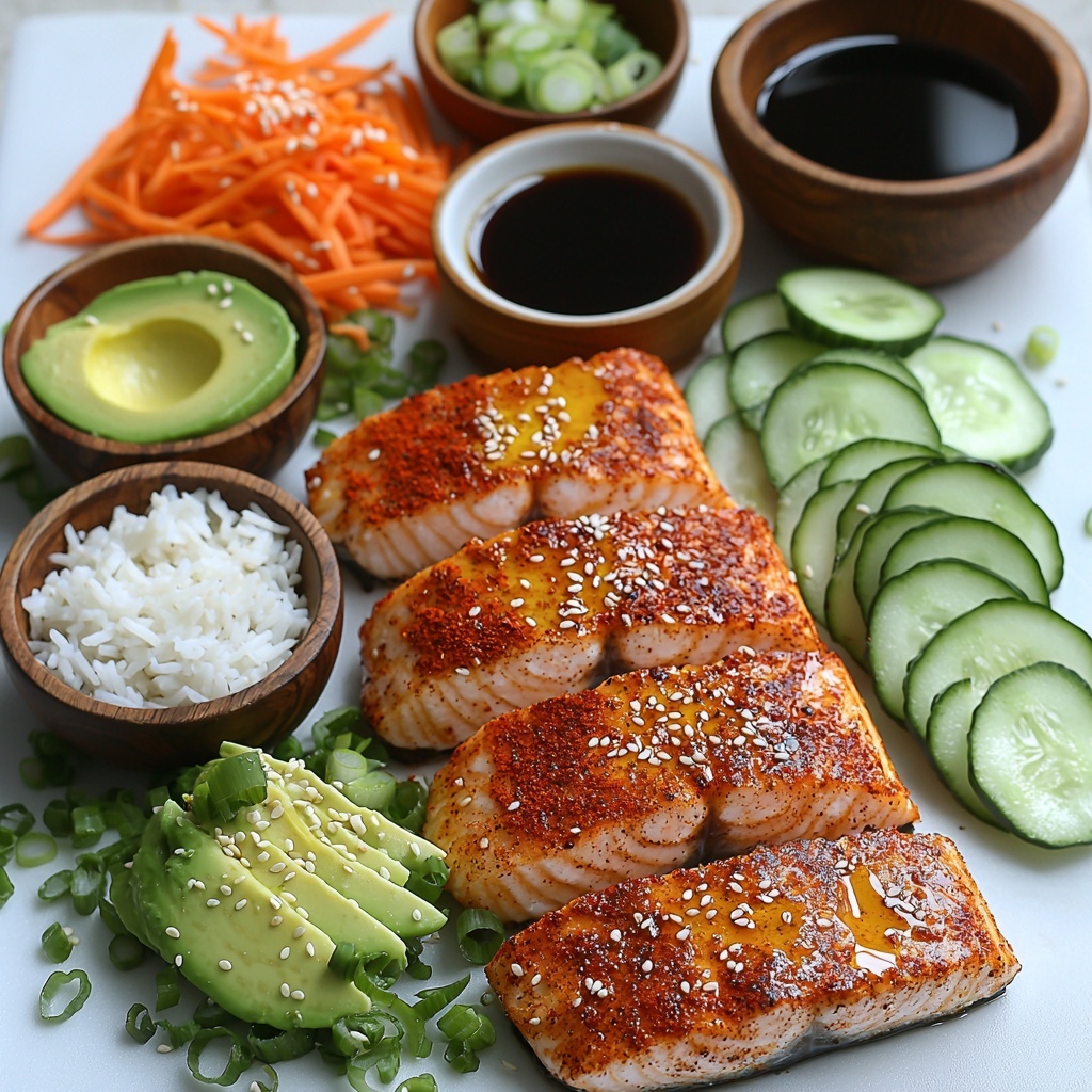 - Assemble Bowls: Divide the cooked rice evenly into four serving bowls. Top each with shredded carrots, cucumber slices, avocado slices, and a baked salmon fillet.
