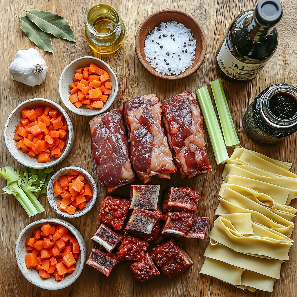 These ingredients come together simply yet powerfully, each bringing a unique layer of taste, texture, or color to the dish. From the rich umami of the short ribs to the vibrant sweetness of fresh vegetables, everything here is essential to crafting that unforgettable ragu.