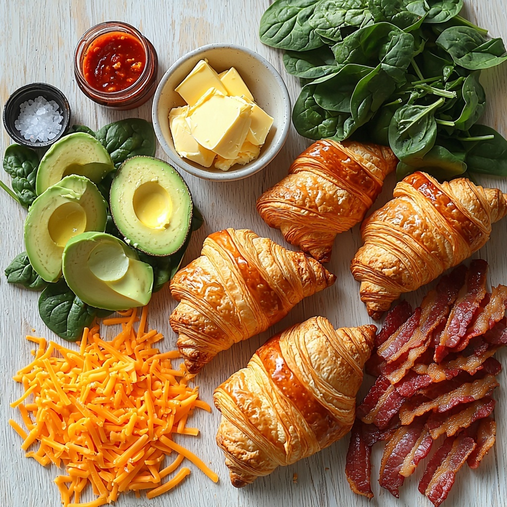 Layer a generous portion of scrambled eggs onto the bottom half of each croissant. Next, sprinkle the shredded cheddar cheese atop the warm eggs so it melts just right. Finish by adding the crispy bacon slices, and for a fresh or spicy kick, add your choice of optional toppings like creamy avocado, vibrant spinach, or zesty hot sauce.