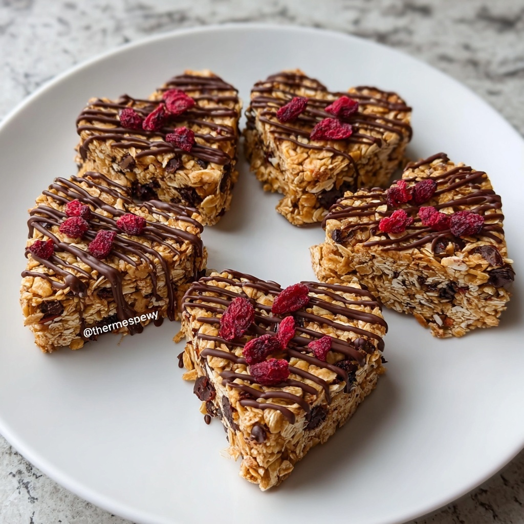 Drizzle the melted dark chocolate over the shaped bars, then sprinkle with chopped dried cranberries. The rich chocolate adds indulgence, while the cranberries provide a tart and colorful contrast, elevating your Crunchy Granola Heart Bars Recipe to the next level.