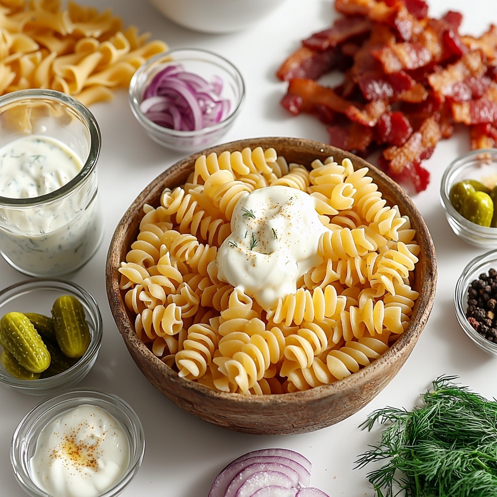 The ingredients in this Dill Pickle Pasta Salad Recipe are surprisingly simple yet carefully chosen to create a harmony of flavors and textures. Each one plays a critical role—from the pasta providing a hearty base, to the fresh dill and pickles adding that signature tang and herbaceous freshness, while the creamy dressing binds everything together beautifully.