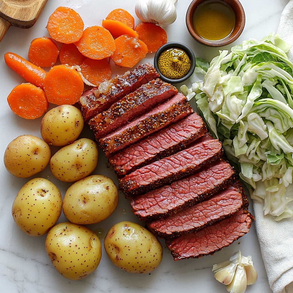 - 2½-3 lb corned beef brisket (flat cut): The centerpiece of the dish, it becomes tender and juicy as it roasts slowly with all the flavors.