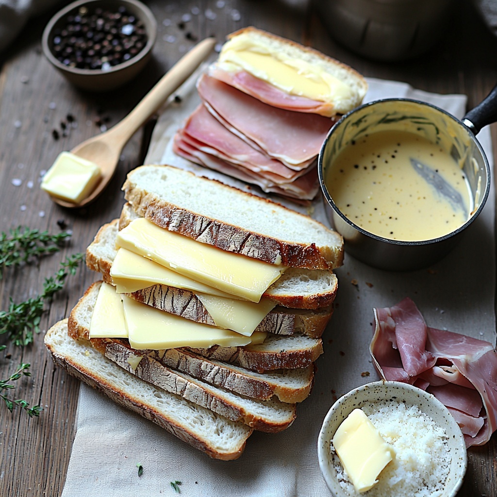 - Assemble Sandwiches: Spoon a generous amount of the warm béchamel sauce over the ham and cheese layered slices. Top each with the remaining bread slices, mustard side down, creating sandwiches.