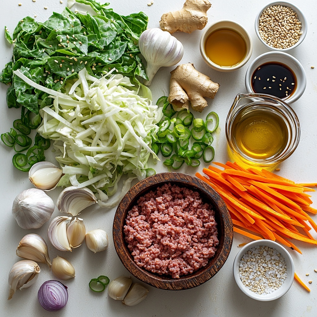 This recipe calls for a handful of simple, fresh ingredients that come together magically to create deep layers of flavor and texture. Each one plays a crucial role, from the hearty ground pork that brings protein and richness, to the crunchy cabbage and carrots that add color and a satisfying bite.