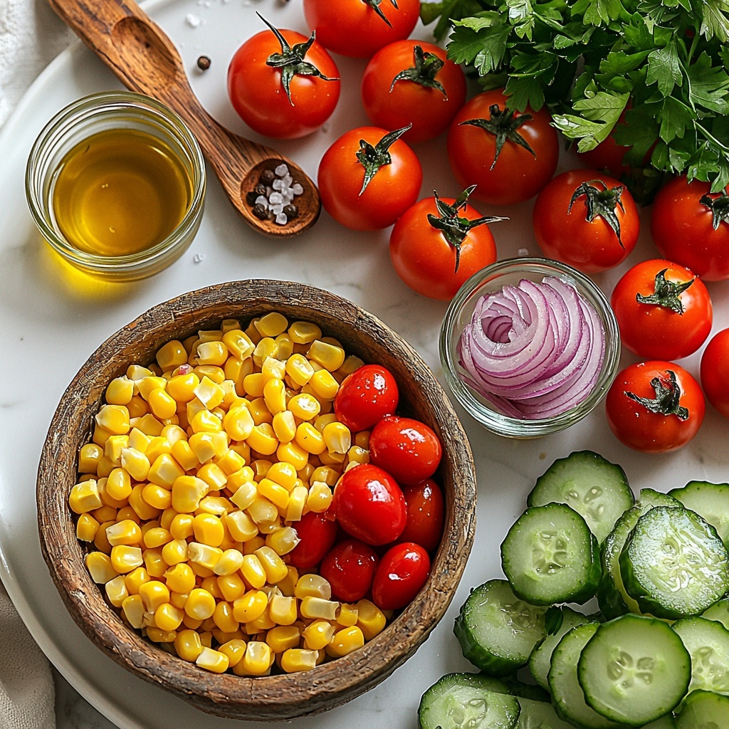 In a large bowl, toss together the sweet corn kernels, quartered cherry tomatoes, sliced cucumbers, and finely diced red onion. Watching these colorful veggies come together is a joy and ensures each bite is packed with exciting flavors.