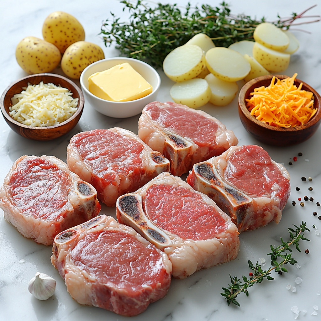 This Garlic Butter Pork Chops with Cheesy Potato Bake Recipe relies on straightforward, staple ingredients that each play a vital role in crafting its rich, savory character. Every element is thoughtfully chosen to add layers of flavor, comfort, and texture to your dish, so gathering these essentials will set you up for delicious success.