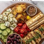 On a large platter or wooden board, arrange the cooked chicken on one side. Surround it with sections of Kalamata and green olives, cubed feta, cherry tomatoes, cucumber slices, and roasted red peppers. This colorful arrangement not only looks stunning but invites guests to mix and match flavors.