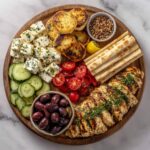 This Greek Chicken & Olive Mezze Board is a vibrant and easy Mediterranean party platter perfect for sharing. Featuring juicy, marinated chicken breast grilled to perfection alongside a colorful assortment of Kalamata and green olives, creamy feta cheese, fresh cherry tomatoes, crisp cucumber slices, and roasted red peppers, all garnished with fresh herbs and served with warm pita or flatbread. It’s a delightful blend of flavors and textures ideal for casual gatherings or antipasto-style meals.