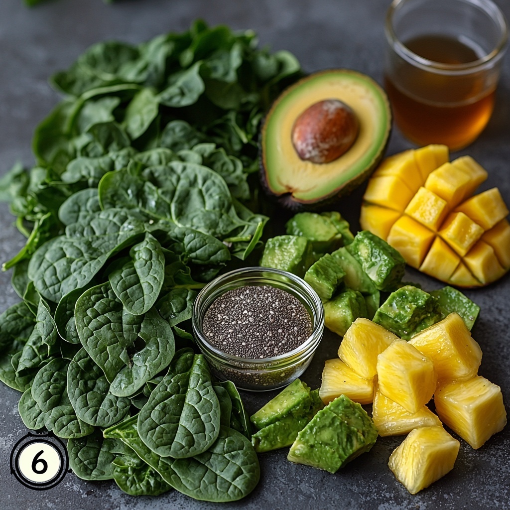 - Add Ingredients to Blender: Place the spinach, frozen banana, frozen pineapple or mango chunks, avocado, and almond milk into a high-speed blender. This combination will create a smooth and creamy base for your smoothie.