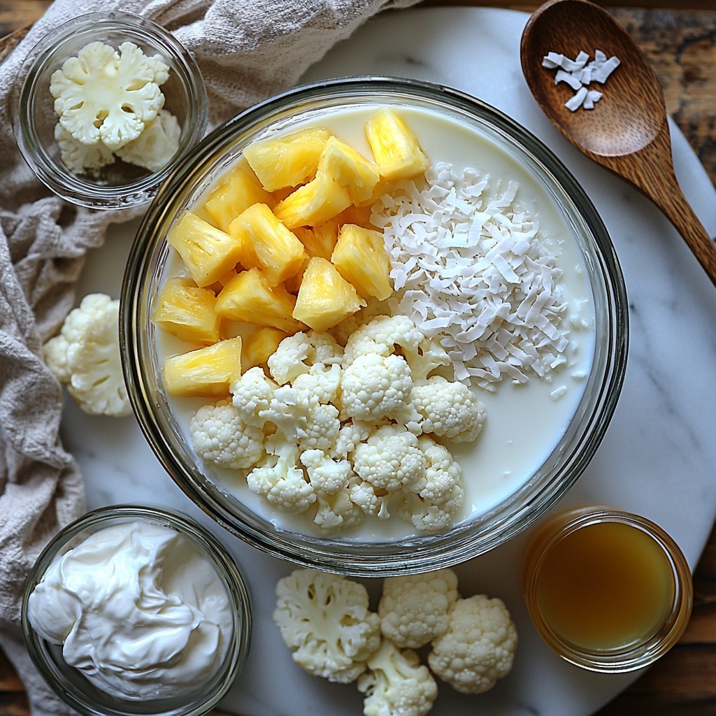 - Combine Ingredients: Place the coconut milk, pineapple juice, frozen pineapple, frozen cauliflower florets, Greek yogurt, and vanilla extract into a high-powered blender.