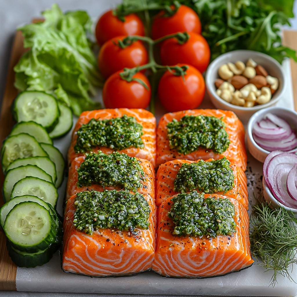 Start by preheating your oven to 400°F and lining a baking sheet with parchment paper, so your salmon cooks perfectly without sticking. Next, whip up the herb paste by mixing olive oil, Dijon mustard, lemon juice, fresh parsley, dill, chives, garlic powder, salt, and black pepper in a small bowl until smooth. This paste is what creates that irresistible Herb-Crusted Salmon Salad Recipe signature crust – fragrant, zesty, and full of fresh garden flavors.
