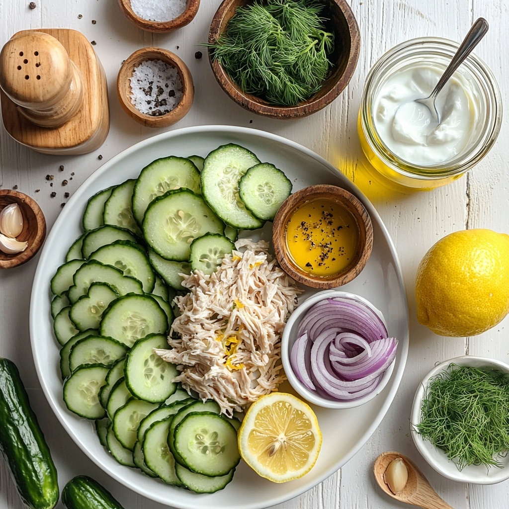 A refreshing and high-protein cucumber salad that combines crisp cucumbers, tender chicken breast, and a creamy Greek yogurt dressing, enhanced with fresh herbs and zesty lemon for a nutritious meal perfect for a light lunch or dinner.