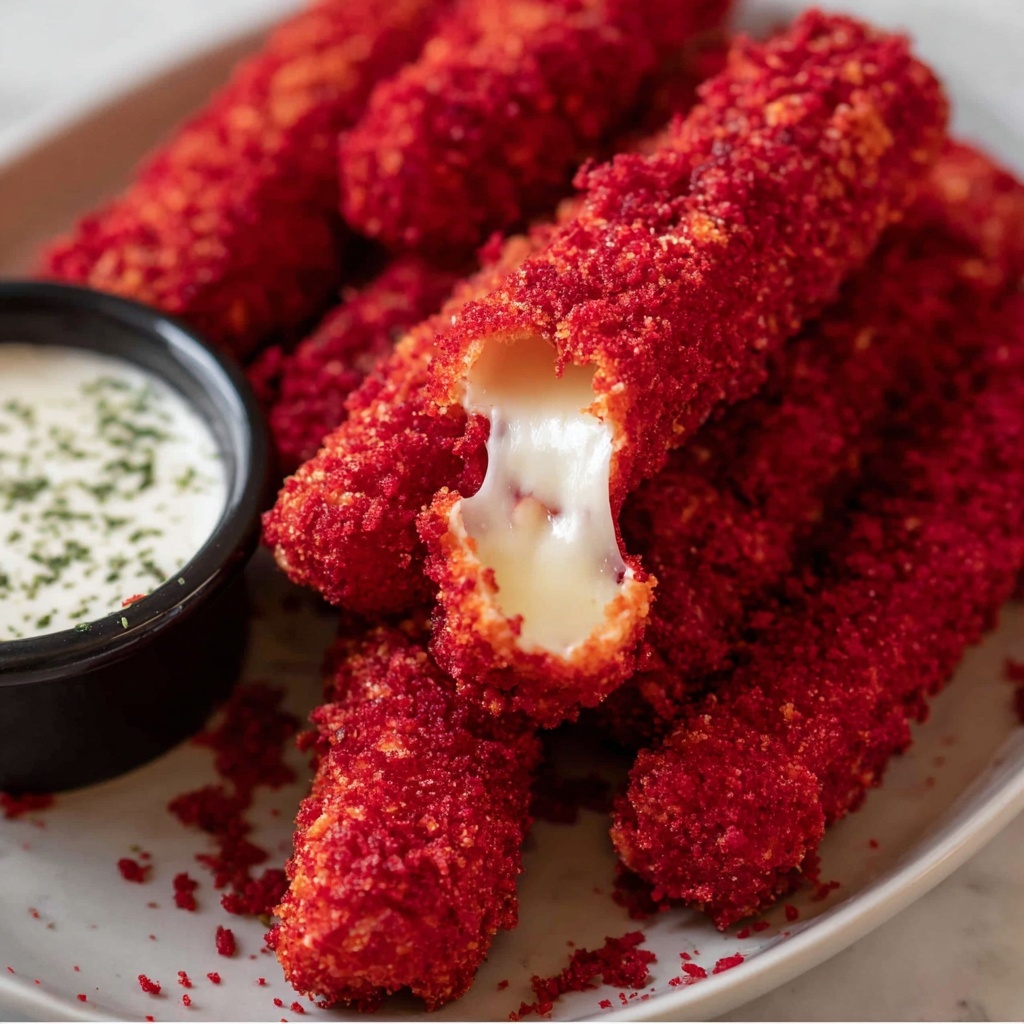 These Hot Cheeto Mozzarella Sticks bring a spicy twist to a classic appetizer. Coated with crushed flaming hot Cheetos, these crispy and melty cheese sticks are air-fried to golden perfection and served with cool ranch or blue cheese dressing for dipping. Perfect for game day or any craving for a tasty snack.