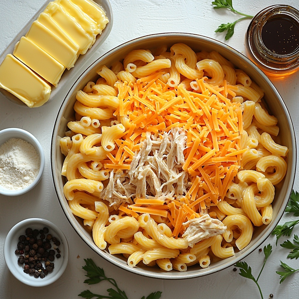 This recipe calls for a straightforward lineup of ingredients that come together to create a rich, velvety sauce, hearty chicken, and perfectly cooked pasta. Each component plays a key role in building layers of flavor and that irresistible creamy texture you crave in mac and cheese.