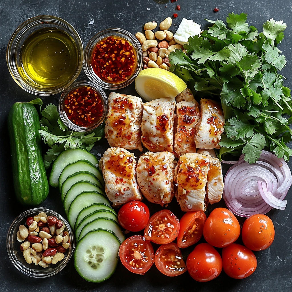 While the chicken rests, whisk together the magic sauce that makes this salad unforgettable. In a small bowl, combine the chili-infused honey and your choice of chili sauce or freshly crushed chili flakes—adjusting the heat to your liking. Add lemon juice or vinegar for that bright tang, plus a pinch of salt to balance things out. Slowly pour in the olive oil as you whisk to create a glossy, smooth dressing that will coat the salad and chicken beautifully.