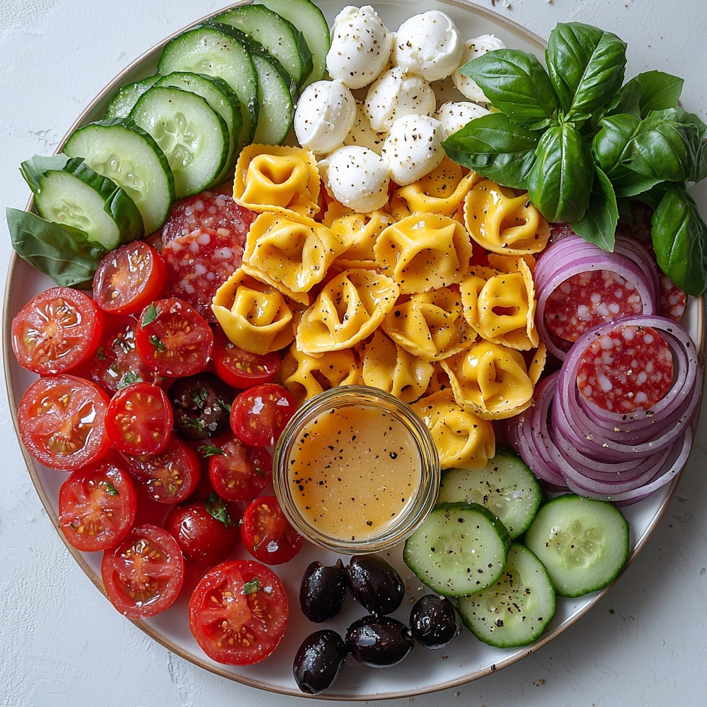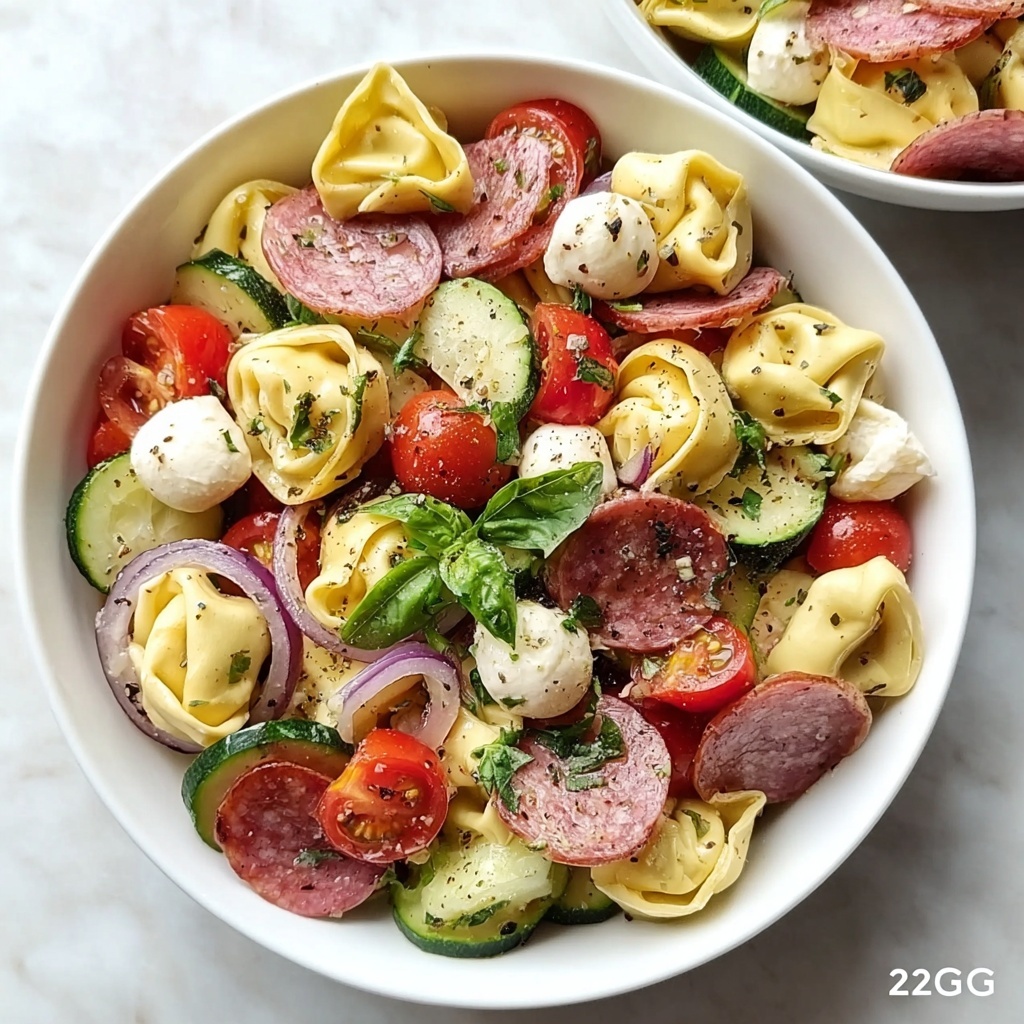 Grab a large salad bowl and layer in the cooled tortellini alongside halved cherry tomatoes, crisp cucumber slices, briny black olives, creamy mozzarella, sharp red onion slices, and diced Italian salami. This colorful medley is what makes this Italian Tortellini Pasta Salad Recipe so inviting — every bite offers a different flavor and texture.