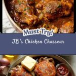 JB’s Chicken Chasseur is a classic French-inspired dish featuring tender chicken thighs and drumsticks simmered in a rich, flavorful sauce made from sautéed mushrooms, onions, garlic, brandy, white wine, tomato paste, and beef stock. Finished with a buttery emulsion and fresh tarragon, this comforting one-pan recipe is perfect served with creamy mashed potatoes, offering a perfect balance of rustic and refined flavors.