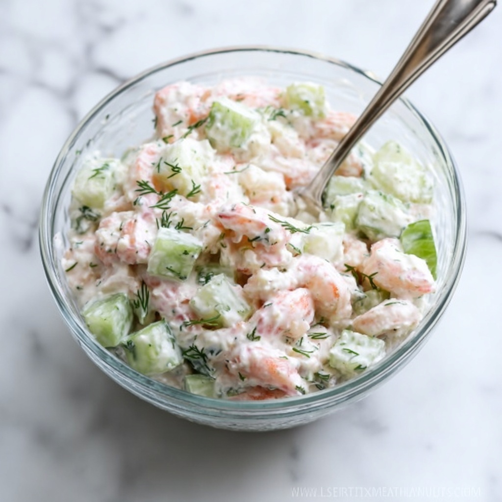 This refreshing Lemon Dill Shrimp Salad features tender, perfectly cooked shrimp tossed with a creamy, tangy dressing made from mayonnaise, sour cream, lime, and fresh dill. Crisp cucumber and green onions add crunch and brightness, making it an ideal light lunch or appetizer.