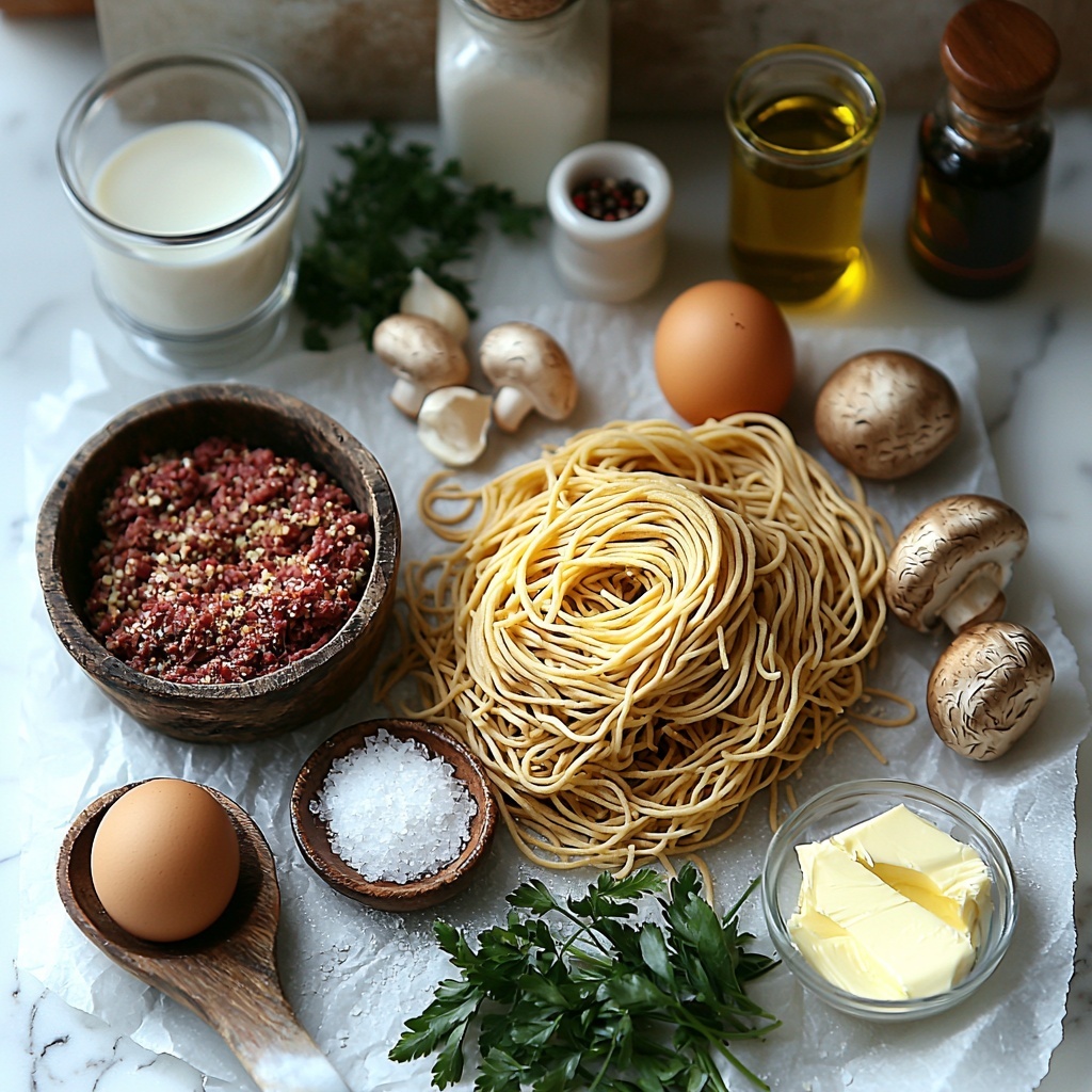 The magic of this dish lies in its simple yet essential ingredients, each contributing to the depth, texture, or color of the final recipe. From the rich blend of meats and aromatic herbs in the meatballs to the creamy mushroom sauce and tender egg noodles, every component plays a starring role.