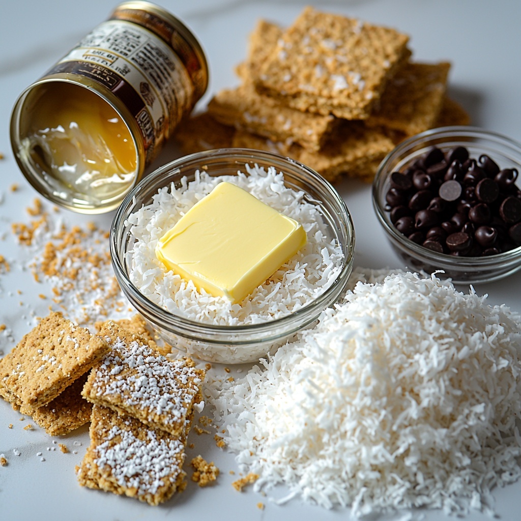 2. Mix in dry ingredients: Add 3 cups sweetened shredded coconut, 1 cup graham cracker crumbs, ¼ teaspoon salt, and ½ cup chocolate chips into the wet mixture. Stir thoroughly until all ingredients are evenly incorporated.