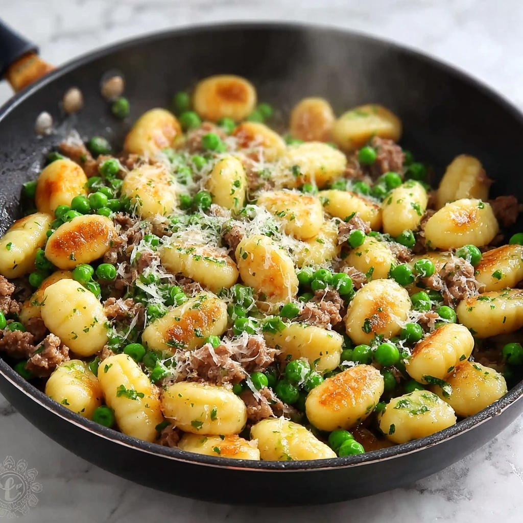 This comforting one-pan gnocchi recipe combines tender potato gnocchi with savory Italian sausage, sweet peas, and a flavorful garlic-onion base. Cooked entirely in a skillet, it delivers crispy golden edges on the gnocchi and a creamy, cheesy finish with Parmesan and chicken broth or cream. Perfect for a quick and satisfying dinner in just 30 minutes!